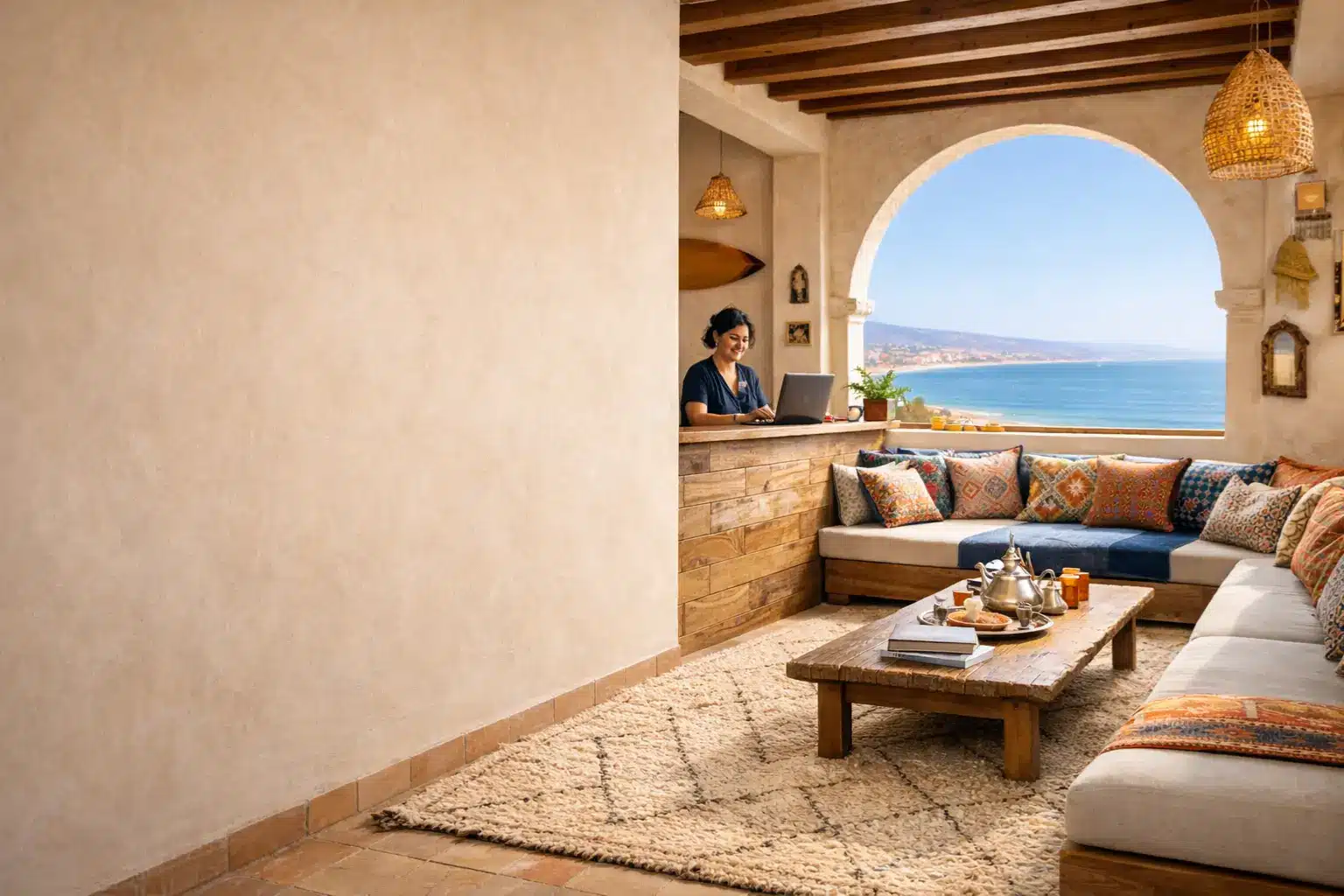 At DRIFTLINE Guesthouse in Tamraght, We offer clean, comfortable shared rooms with shared bathrooms, styled with authentic Moroccan touches and a welcoming atmosphere. After a day of surf and yoga, you can unwind on our rooftop terraces with ocean views or relax in the courtyard — perfect spaces to soak in the peaceful vibes and connect with other travelers – Best guesthouse in tamraght